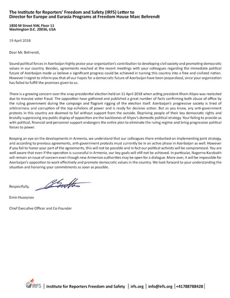 11 апреля 2018 года в Азербайджане состоялись внеочередные выборы президента, по результатам которых ожидаемо победил действующий глава государства Ильхам Алиев. Ключевые оппозиционные партии страны отказались выставлять своих кандидатов и предупредили, что не признают результатов голосования. По их мнению, граждане Азербайджана должны выйти на митинги протеста и потребовать от вновь избранного президента отказаться от своего поста. Репетицией народного восстания стал митинг, проходивший в Баку 10 марта под лозунгами: "Внеочередная диктатура", "Конец диктатуре, конец грабежу, конец монархии", "Жизнь закончится, а кредиты нет", "Здравоохранение в агонии, образование больно" и т.п. Однако на этом дело оппозиции застопорилось: они не смогли организовать ни одного крупного антиправительственного мероприятия ни в одном из городов Азербайджана. Частично это бездействие объясняется в гневном послании главы Института свободы и безопасности журналистов Эмина Гусейнова директору Freedom House по европейским и евразийским программам Марку Берендту (Marc Behrendt).