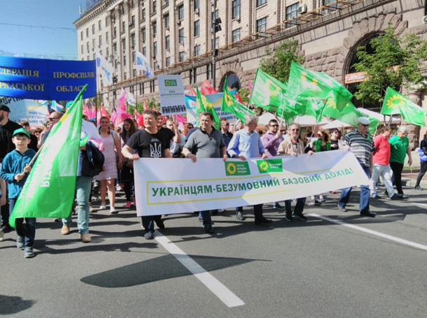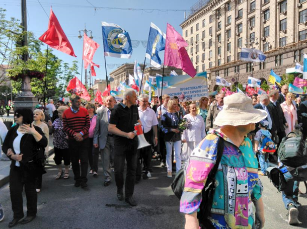 1 мая в Киеве прошла демонстрация профсоюзов и социалистов. Флаги, плакаты и люди, изображающие радость прошли по Крещатику. Позже это переросло в митинг.