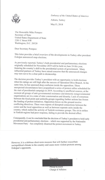 За повідомленням the Anadolu news agency віце-прем'єр турецького уряду Бекір Боздаг (Bekir Bozdağ) заявив про те, що гучне рішення про проведення дострокових виборів "дозволило викрити антитурецькі плани" (has become a step which helped foil the plans of anti-Turkish forces) (aa.com.tr/en/politics/turkish-pm-early-elections-process-to-start-immediately/1121988). Судячи з останніх новин, перенесення виборів дійсно вніс сум'яття в ряди турецької опозиції, привівши прихильників Фетуллаха Ґюлена в стан повної розгубленості. Зірвано масштабні акції протесту, які планувалися ними на листопад 2019 року. Цьому присвячено лист тимчасового повіреного в справах США в Туреччині Філіпа Коснетта держсекретареві Майку Помпео.