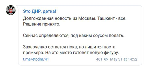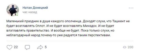«Маленький праздник в душе каждого ополченца. Доходят слухи, что Ташкент не будет возглавлять Оплот. И не будет возглавлять Минздох. И не будет влзглавлять правительство. И вообще не будет. Пока только слухи, но неблагодарный народ почему-то уже радуется таким перспективам.», — написал блогер.