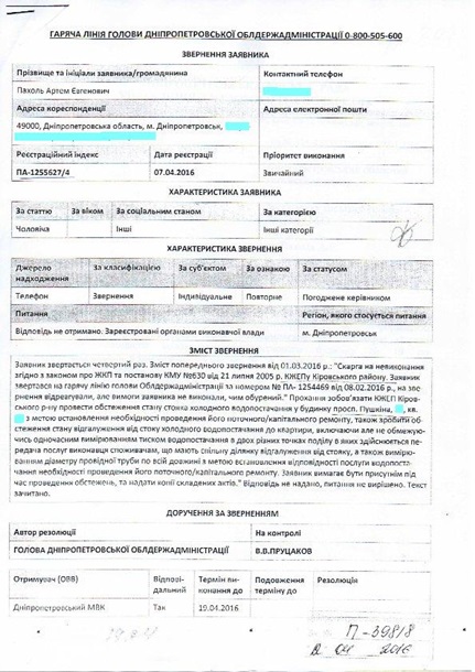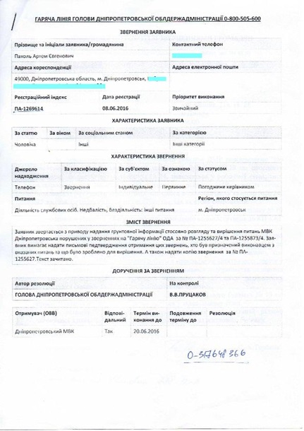 начальника управління по роботі із зверненнями громадян Дніпропетровської