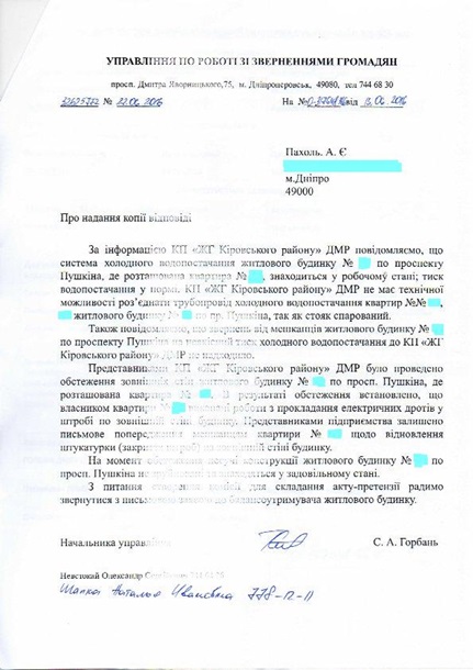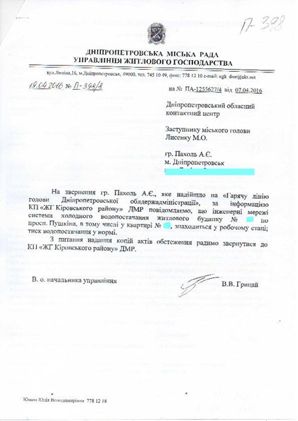 управління житлового господарства Дніпропетровської міської ради В.В. Грицая та