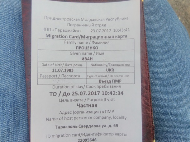 Кучурган/Первомайское. Пограничный пункт. Контроль на границе был пройден достаточно быстро, несмотря на то, что пассажиры автобуса говорили, что может быть очередь и сам таможенный контроль займет не менее часа. Обе границы были пересечены не более чем за полчаса. При въезде в Приднестровье мне выдали миграционную карту, которая очень напоминала чек из электронной очереди в каком-нибудь банке или офисе админ услуг.