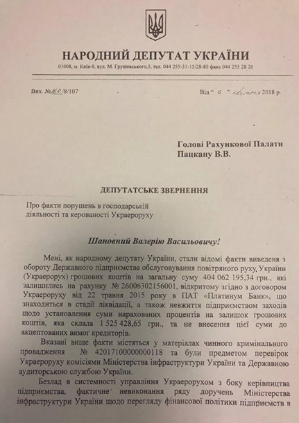 квітні 2018 року, до Рахункової палати звернувся народний депутат, голова
