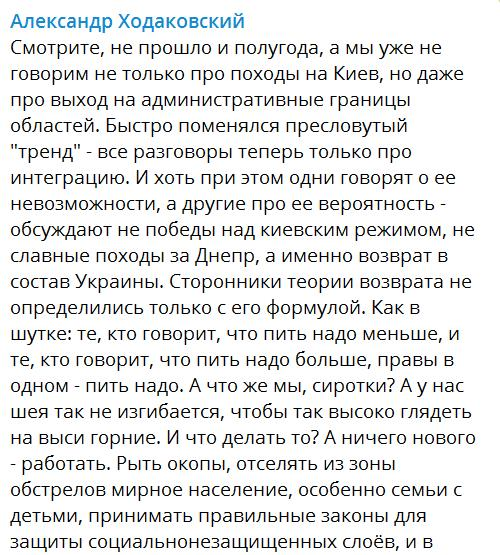 "Смотрите, не прошло и полугода, а мы уже не говорим не только про походы на Киев, но даже про выход на административные границы областей. Быстро поменялся пресловутый "тренд" — все разговоры теперь только про интеграцию. И хоть при этом одни говорят о ее невозможности, а другие про ее вероятность — обсуждают не победы над "киевским режимом", не славные походы за Днепр, а именно возврат в состав Украины. Сторонники теории возврата не определились только с его формулой. Как в шутке: те, кто говорит, что пить надо меньше, и те, кто говорит, что пить надо больше, правы в одном — пить надо", — негодует Ходаковский.