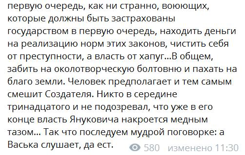 "Человек предполагает и тем самым смешит Создателя. Никто в середине тринадцатого и не подозревал, что уже в его конце власть Януковича накроется медным тазом... Так что последуем мудрой поговорке: а Васька слушает да ест", — с весьма сомнительной надеждой подытожил Ходаковский.