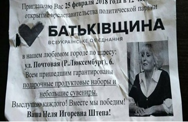 Незадолго после ее заявления в городе Славянске были распространены листовки с приглашением от экс-мэра Славянска Нели Штепы на открытие 25 февраля представительства политической партии ВО «Батькивщина» и обещаниями о продуктовых наборах и сувенирах.
