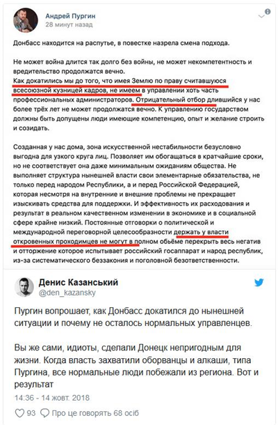 "Пургин вопрошает, как Донбасс докатился до нынешней ситуации и почему не осталось нормальных управленцев. Вы же сами, идиоты, сделали Донецк непригодным для жизни. Когда власть захватили оборванцы и алкаши, типа Пургина, все нормальные люди побежали из региона. Вот и результат", – написал Казанский.