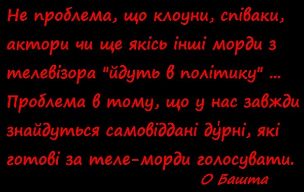 Не ведіться на дурню з телевізорів, тому що так нам вже недовго колобка чи буратіно в президенти висунути, а саме страшне, їх обрати в президенти.