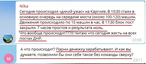 «Дикий ужас на Каргилле (Донецк)… Движение происходило по 10 машин в час. В 17:30 блокпост закрыли. 7 часов простоя и результата ноль. Что вообще происходит?»
