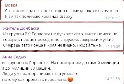 «Горловка. Не пускают авто. Никто ничего не говорит. Пешие проходят с трудом. Задержки жуткие. Очередь авто – конца и края не видно. Людей тьма».