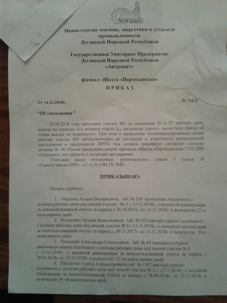 горняки участка № 5 шахты «Партизанская» в городе Антрацит оккупированной части