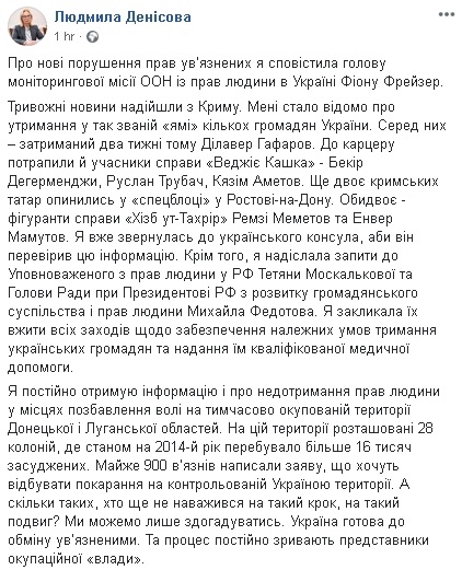 "Тревожные новости пришли из Крыма. Мне стало известно о содержании в так называемой яме нескольких граждан Украины. Среди них - задержанный две недели назад Дилявер Гафаров. В карцер попали и участники дела "Веджие Кашка" - Бекир Дегерменджы, Руслан Трубач, Кязим Аметов. Еще двое крымских татар оказались в "спецблоке" в Ростове-на-Дону. Оба - фигуранты дела "Хизб ут-Тахрир" Ремзи Меметов и Энвер Мамутов", - пишет Денисова, отмечая, что уже обратилась к украинскому консулу, чтобы он проверил эту информацию, а также послала запросы уполномоченному по правам человека в РФ Татьяне Москальковой и председателю Совета при Президенте РФ по развитию гражданского общества и правам человека Михаилу Федотову.