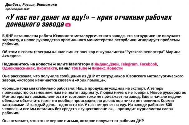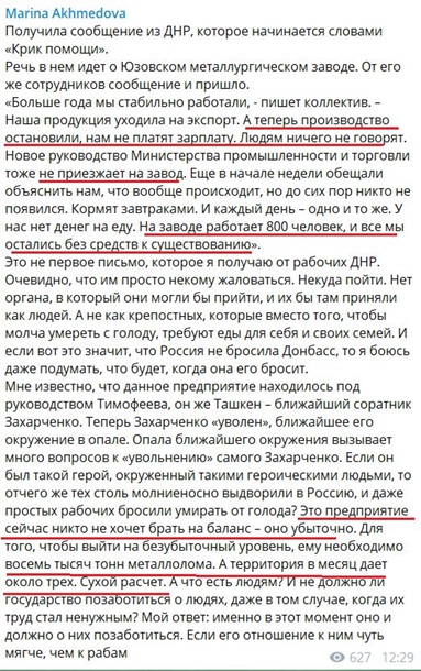 Похоже, с подобной ситуацией столкнулся и Юзовский металлургический завод в Донецке (смотри скрины). Подробно на проблеме остановилась активистка «русского мира» Марина Ахмедова: