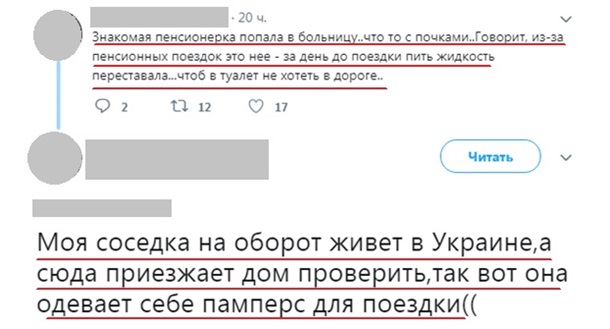 «Знакомая пенсионерка попала в больницу… что то с почками… Говорит, из-за пенсионных поездок это нее — за день до поездки пить жидкость переставала… чтоб в туалет не хотеть в дороге..»,