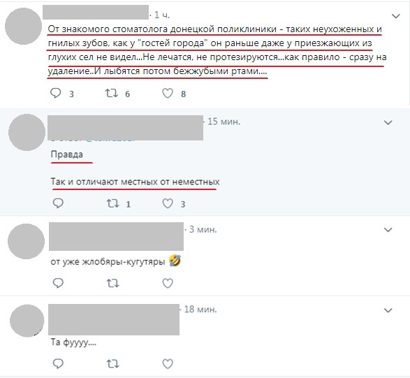«От знакомого стоматолога донецкой поликлиники — таких неухоженных и гнилых зубов, как у «гостей города» он раньше даже у приезжающих из глухих сел не видел… Не лечатся, не протезируются… как правило — сразу на удаление… И лыбятся потом бежжубыми ртами....»,