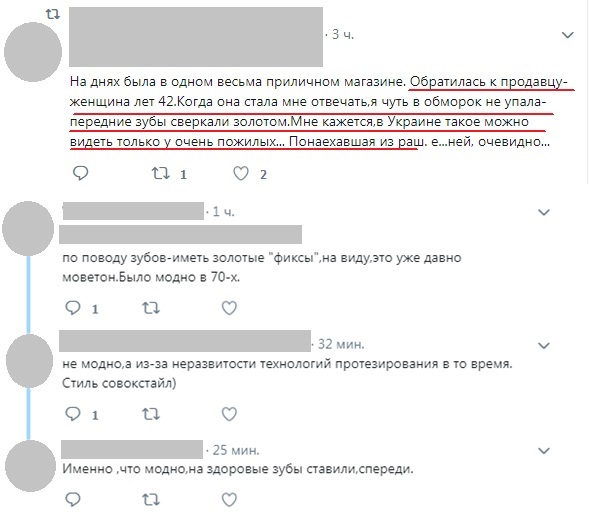 «На днях была в одном весьма приличном магазине. Обратилась к продавцу-женщина лет 42.Когда она стала мне отвечать, я чуть в обморок не упала-передние зубы сверкали золотом. Мне кажется, в Украине такое можно видеть только у очень пожилых… Понаехавшая из раш. е… ней, очевидно...»,