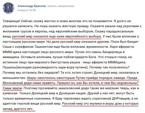 Александр Краснов: «…Русский мир оказался еще хуже европейского выбора… Путин – это смесь бандеровца и МММщика… ШАры захотелось: «Путин придет, порядок наведет»… Пришел он. Чем недовольны? Сами звали. Московский дядя такая же мразь, как и киевский. Только Донецкий мир и Донецкая нация…Русский мир – это жулики и воры, дом у которых запад».