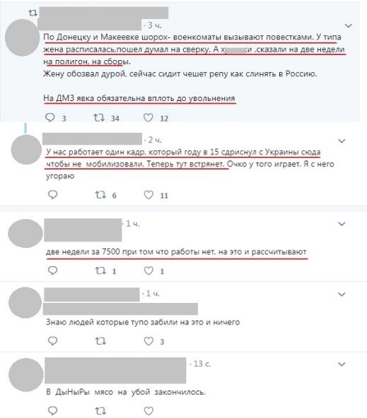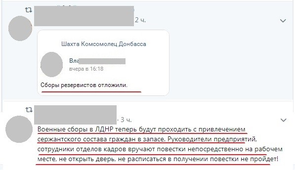 - «По Донецку и Макеевке шорох- военкоматы вызывают повестками. У типа жена расписалась, пошел думал на сверку. А ху*юшки, сказали на две недели на полигон, на сборы. Жену обозвал дурой, сейчас сидит чешет репу как слинять в Россию. На ДМЗ явка обязательна вплоть до увольнения»;