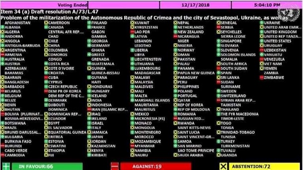 Это голосование за резолюцию Генеральной Ассамблеи ООН «Проблема милитаризации Автономной Республики Крым и города Севастополь (Украина), районов Черного и Азовского морей». В ней содержится требование к РФ убраться из Крыма, освободить захваченные корабли и членов экипажа, осуждается милитиразация Азовского и Черного морей.