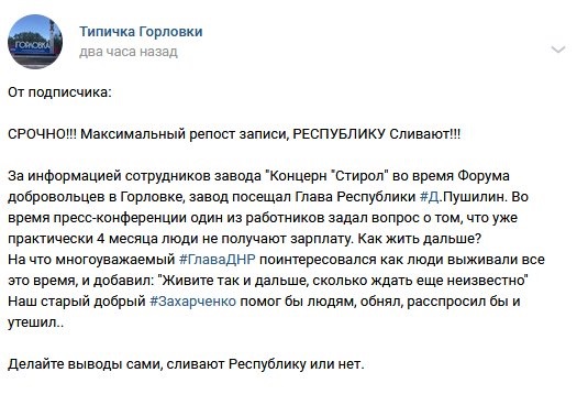 Тем временем, главарь террористической ДНР Пушилин предложил «стироловцам» ждать работы и зарплаты бесконечно долго: «Живите так и дальше, сколько ждать еще, неизвестно».