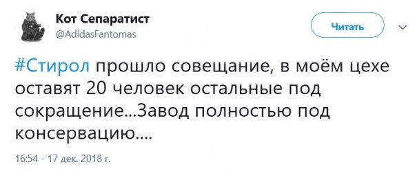 Впрочем, «Кот Сепаратист» – сотрудник «Стирола» – пишет, что грядет большое сокращение штата и логичное закрытие завода: