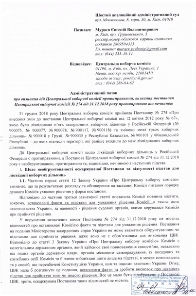 Сегодня партия "НАШИ" подала административный иск о признании действий Центризбиркома противоправными и отмене ее решения №274 от 31.12.2018 г. В нем не эмоции, а четкая констатация фактов. Во-первых, ЦИК не имел никаких оснований для принятия подобных решений. Представление ведомства Климкина можно было прочитать, но далее, как самостоятельный и независимый орган, Комиссия обязана установить конкретные факты и делать выводы из них.
