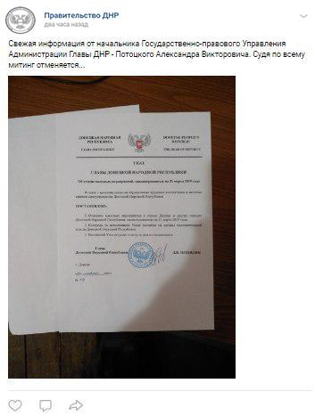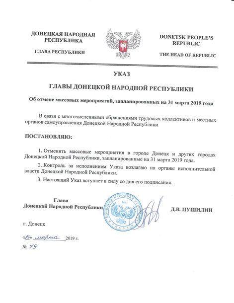 29 марта 2019 года Пушилин подписал Указ об отмене митинга. Насколько известно,
