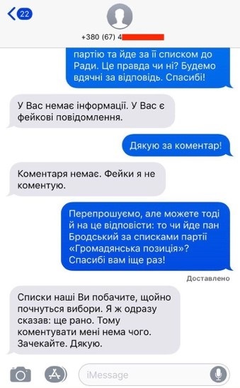 переписке Гриценко заявил, что информация СМИ якобы о том, что Михаил Бродский