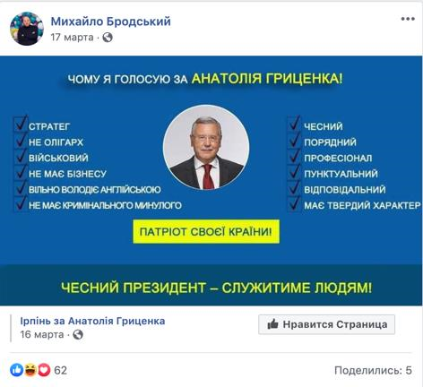 Бродский не скрывал симпатий, активно поддерживая Анатолия Степановича в Facebook. Вот один из примеров: бизнесмен Бродский в роли «opinion makers»: