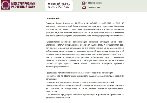 28.03.2019 у ООО КБ «Международный расчетный банк» отозвана лицензия на осуществление