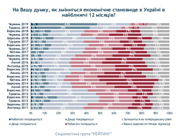 Согласно социологическим исследованиям, половина населения Украины ожидает улучшения экономического положения. 43% граждан ожидают «некоторого улучшения», 5% ожидают «значительного улучшения» в течение ближайших 12 месяцев. Радикально сократились опасения того, что станет хуже, чем было — 3%. По сравнению с предыдущими годами, начиная с 2011 года, это рекордные показатели.