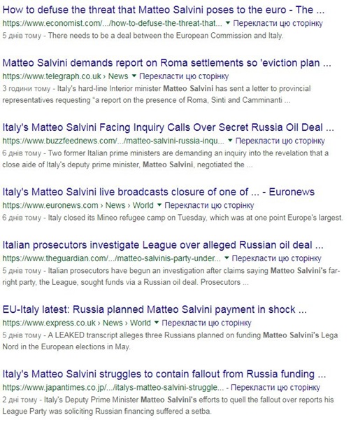 заголовками про зв’язки Сальвіні з Путіним, про скандал з фінансуванням партії,