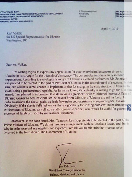 В распоряжение редакции «Союза блогеров Украины» попало письмо Кахконен к Волкеру от 4 апреля 2019 года.