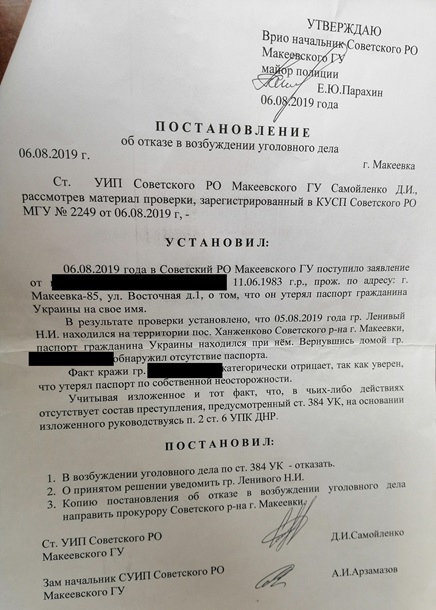 по которой гражданина “ДНР” пытались осудить за утерю украинского паспорта: