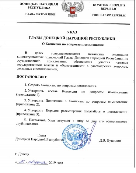26 августа глава “Донецкой народной республики” подписал указ №261 о “Комиссии по вопросам помилования”.