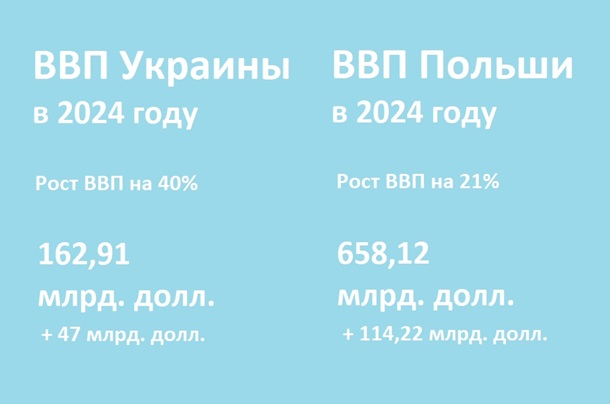 По данным МВФ за 2018 год, ВВП Украины — 124,6 млрд. долл., ВВП Польши — 586 млрд. долл.