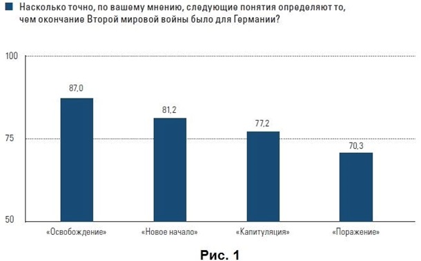 Согласно телефонному опросу, проведённому в декабре прошлого года Институтом изучения общественного мнения «Ipsos» по поручению Института междисциплинарного исследования конфликтов и насилия (IKG) Билефельдского университета представления немцев об итогах Второй мировой войны для Германии остаются двойственными