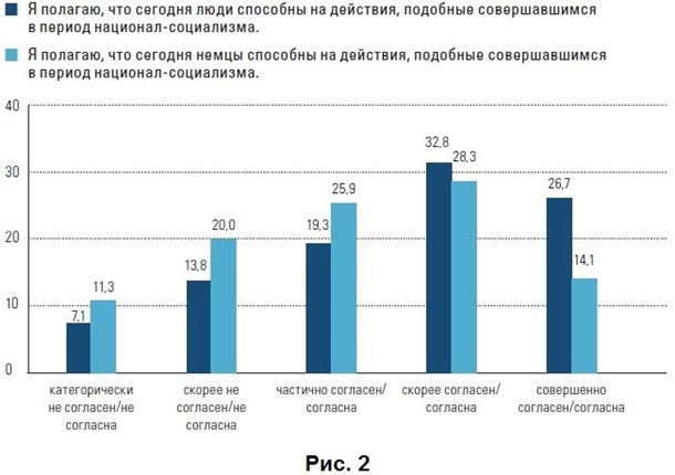 Наряду с уверенностью, что и сегодня люди способны на преступления, совершенные в период нацистской диктатуры (59,5% в целом согласны с этим, 20,9% в целом не согласны), респонденты значительно менее склонны считать современных немцев способными на такие действия (37,0% в целом согласны, 31,3% отрицает подобную возможность).
