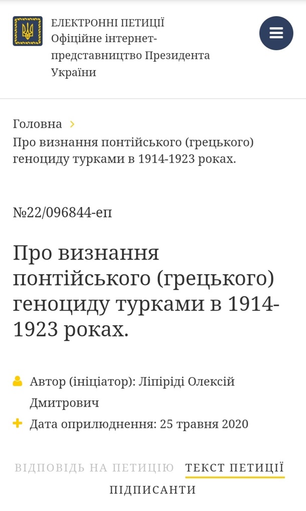 петиція №22/096844-еп «Про визнання понтійського (грецького) геноциду турками в