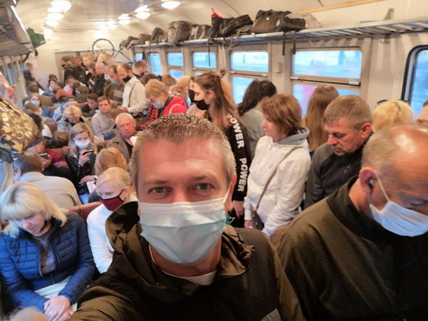 Доречі, Київ в помаранчевий зоні і кількість людей всередині транспорту має бути половиною від кількості сидячих місць. Це теорія, яку ви прописали. А на практиці приїжджайте на ст. Святошин до електрички Київ-Коростень та скажіть людям, щоб займали тільки половину місць для сидіння, а їхати стоячи взагалі не можна. Фото зроблено саме в цій електричці і така вона кожного дня.