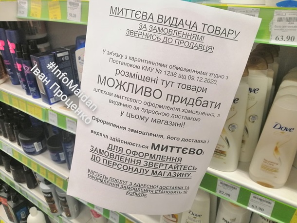 І в Eva можна купити абсолютно все, що забажаєте. Просто береш з полиці товар і несеш його на касу. Там касир як завжди пробиває товар, зараховує бонусні бали на вашу картку мережі і каже, що буде + 10 копійок, бо це символічно за доставку, але є акційна знижка у вигляді 10 копійок. Тобто вони замкнули це просто в нуль і працюють в звичайному режимі. Потім ви отримуєте чек, забираєте покупку і йдете по своїх справах. І такі ось папірці висять по магазину, як на фото - тобто це все робиться навіть не приховуючи.