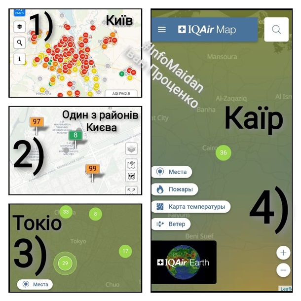 1) Так показано повітря в Києві. Забруднення досить серйозне. Ну, так показує сайт.