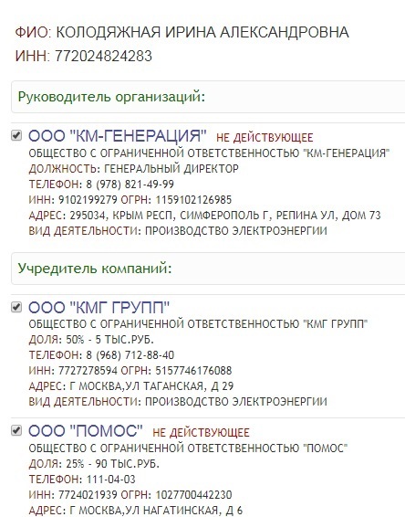 фирмы «КМГ Групп» и нескольких компаний в Крыму Ирину Колодяжную, а также генерального директора московского ОБЩЕСТВА С