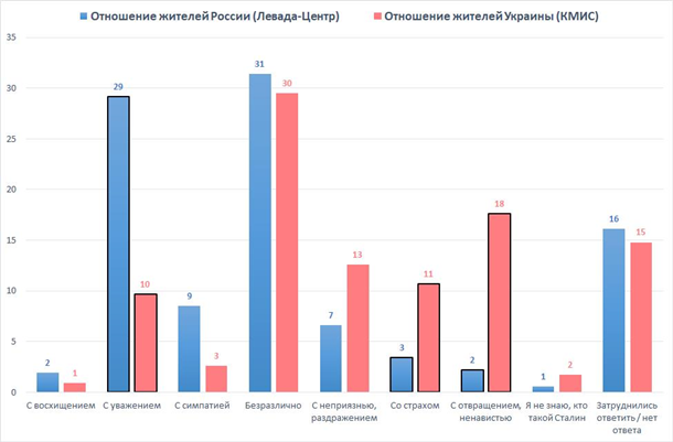 количество украинцев и россиян относятся к Сталину «безразлично», либо никогда