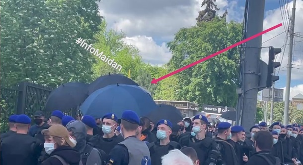 Вчора під судом тітушок Медведчука закидували яйцями. Погода була ясна та сонячна. Але у них чисто випадково опинилися величезні парасольки.