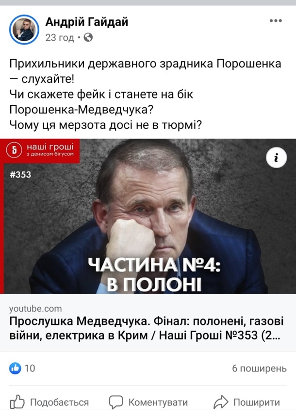себе на сторінці «Фейсбук» написав: «Прихильники зрадника Порошенка – слухайте!