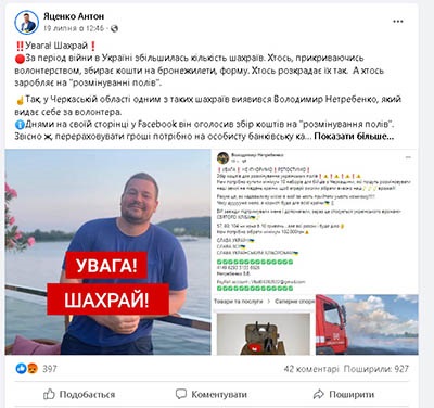Це черкаський волонтер Володимир Нетребенько. Він отримав справу за мошенництво, бо оголошував збір на обладнання для саперів. У своєму рідному місті Ватутіні він припустився однієї помилки – не взяв дозволу на роботу у нардепа Яценка.