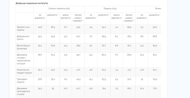 інститутів, найбільше українці довіряють ЗСУ (93%). Високий рівень довіри серед