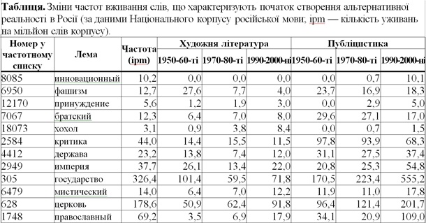прошлое, традиция». Наведені в таблиці дані частотного словника цілком підтверджують